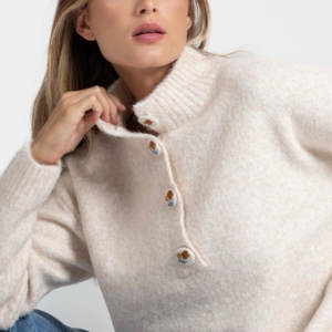 37,90 € 37,90 €Tejido punto. Cuello subido con botones bordados. Manga larga. Acabados rib. Composición: 38% Acrílico, 35% Poliéster, 15% Poliamida, 8% Lana, 4% Elastano