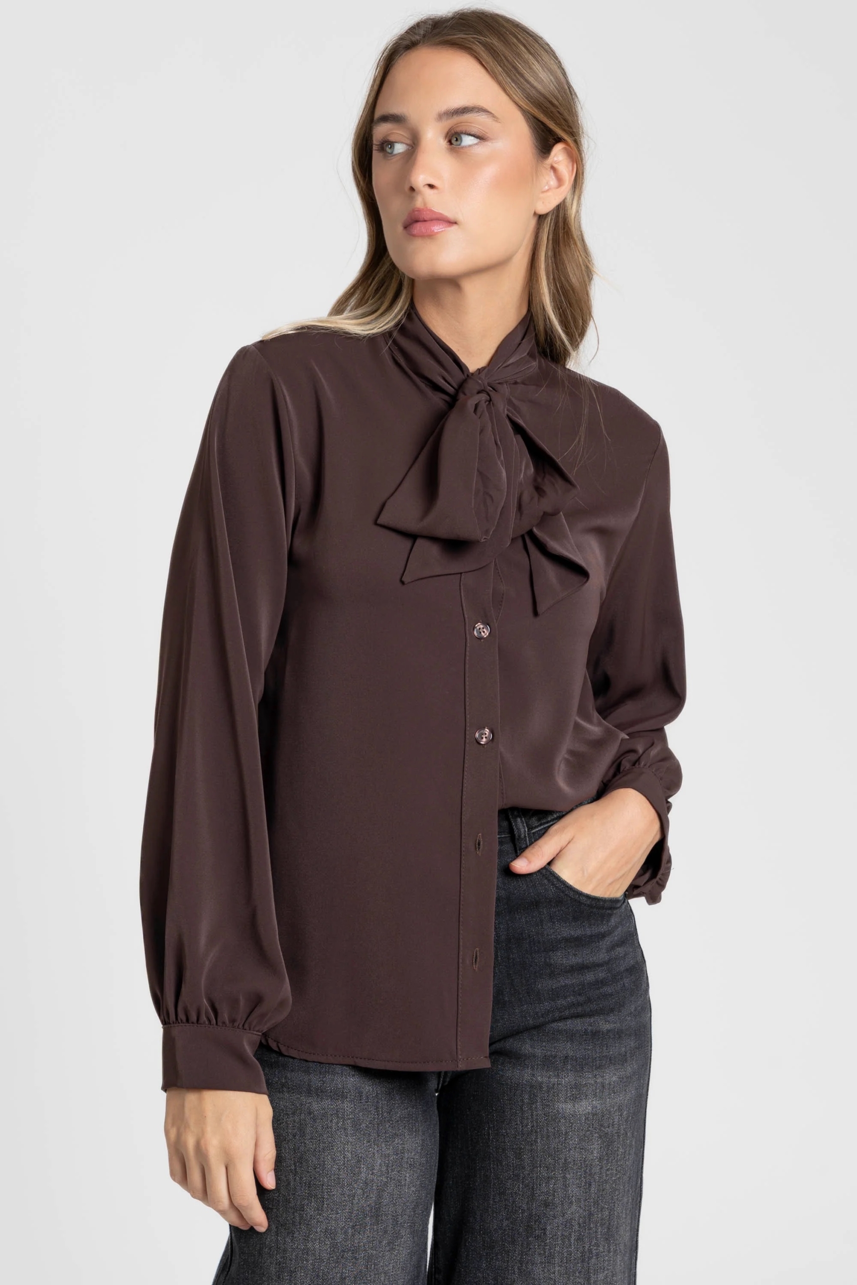 Tejido fluido. Cuello con lazada. Manga larga. Cierre de botones.
