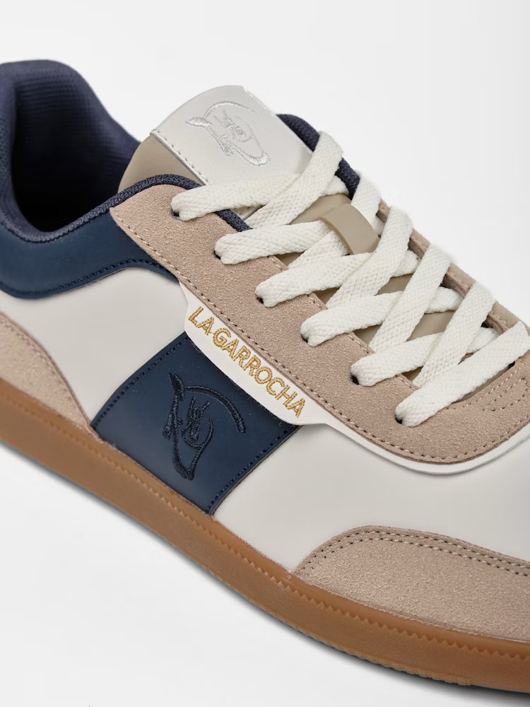 Zapatilla deportiva para hombre de diseño casual en color azul marino. Exterior en piel sintética con banda lateral a contraste y detalle de nuestra marca bordado. Lengüeta personalizada y talonera de piel sintética. Cierre con cordones textiles. Piso de goma en color ámbar cómodo y ligero.